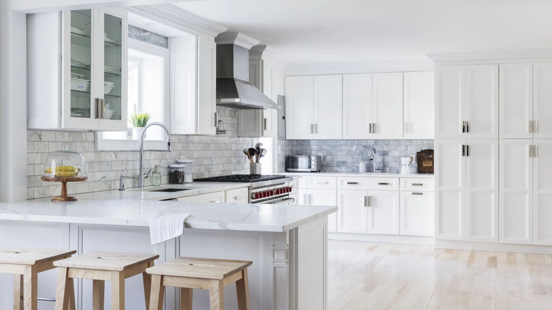 · ¾” adjustable shelves edge-banded in wood veneer natural finish